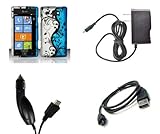 This combo pack includes a case (Black Flower Vines on Blue and Silver Design), wall charger, car charger, and 2.0 Micro USB Data cable for the AT&T Samsung Focus Flash (SGH-I677). The case is made of hard plastic with a rubberized coating on the exterior. Case provides excellent protection from damage due to high impact falls. The case comes in 2 pieces and snap to the back and front of phone. Car charger and wall charger are brand new, individually sealed and packaged. Both chargers have an excellent quality build, not cheap and flimsy like other accessories. They come with an LED indicator to let you know when the phone is charging. Also come with built in I/C chip that prevent the phone from charging too fast and overcharging the battery. Both chargers will safely charge the battery to 100% usually within 2 hours. Phone can be used while charging but we suggest you do not operate your phone while driving. The 2.0 Micro USB Data cable is light weight and perfect for travel. It can charge your phone from any USB port. The USB cable can sync data from your computer to your phone. Please keep in mind we do not provide the USB cable drivers for your phone and you might have to download them from Samsung's website to sync your phone to your computer. These accessories are not OEM products from Samsung or AT&T directly, but rest assured they are manufactured with the highest quality materials and craftsmanship. Atom LED keychain light is included. Dropped your phone in the dark? This LED keychain is perfect for illuminating dark areas. Has an ON/OFF switch and pressure button. Comes with 3v watch battery. Attaches easily to any keychain. All accessories are made for the Samsung Focus Flash (SGH-I677) offered on the AT&T network. Black Flower Vines on Blue and Silver design premium case with a rubberized exterior. Comes with ATOM LED keychain light Car charger with intelligent I/C chip to prevent over charging and over heating Wall charger with intelligent I/C chip to prevent over charging and over heating 2.0 Micro USB Data cable (3 ft) charges phone and syncs data from any computer USB port. Drivers are not included All accessories are premium quality and manufactured for the Samsung Focus Flash (SGH-I677) on the AT&T network.